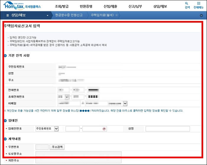 2. 주택임차료 신고서 입력화면 > 임대인 성명, 주민번호, 월세 지급일, 인적사항 등 정보 입력 > 계약서 파일 첨부