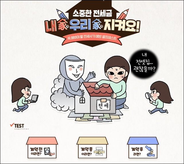 국토교통부는 전세 수요자들을 위해 자가 진단 테스트 외에도 '전세가율', '권리관계', '임차인 대항력', '안전한 거래방법' 등 계약 시 유의해야 할 사항에 대해 쉽게 설명한 유튜브, 웹툰, 카드 뉴스도 계획 중이라고 합니다. 또한 무료 법률 상담이나 전세 피해지원센터 이용 방법도 안내한다고 하니 세입자라면 꼭 들어가서 확인하세요.