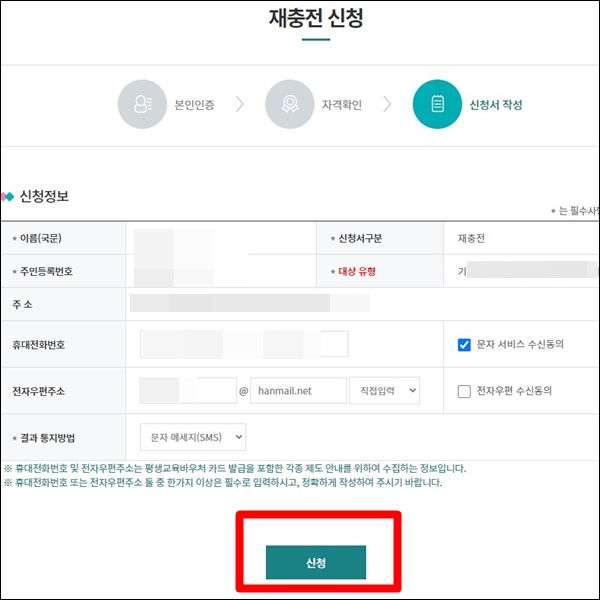 상세 내용 [이름/ 주민번호 / 대상유형 / 주소 / 전화번호 등] 확인 후 [신청] 버튼 클릭 >