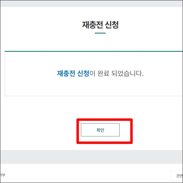 홈페이지 로그인 > 메인 화면 [우수이용자 재충전 신청] 클릭 > 재충전 신청 [이름, 주문번호, 대상유형] 확인 후 확인버튼 >