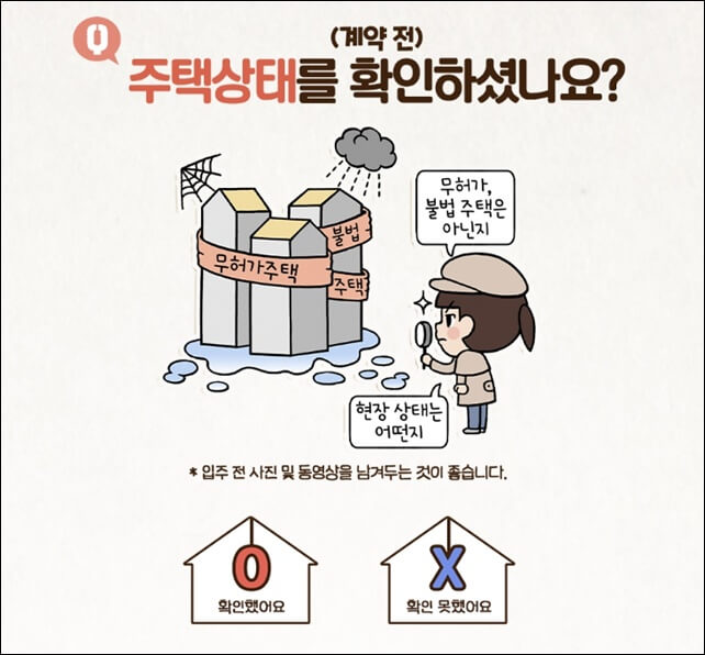- 문제가 있는 집은 전세 대출이 나오지 않기 때문에, 전세 대출을 이용하지 않더라도 부동산에 대출 가능 여부를 확인해보자